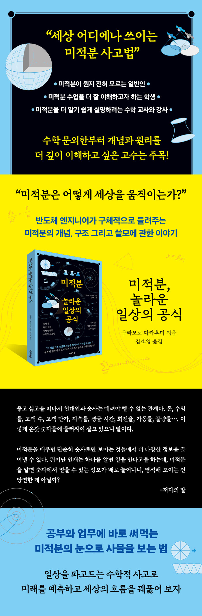 최근 사회 각 분야의 전문성이 깊어지면서 개인이 갖추어야 할 기본 소양의 폭 또한 넓어지고 있다. 특히 미적분 개념은 현대인의 생활과 떼려야 뗄 수 없는 관계이다. 고객 수나 가격 관리, 수익률, 회전률, 가동률, 불량률… 등 수없이 많은 부분에서 핵심 툴로 사용된다. 갈수록 미적분의 중요성이 커지면서 대중의 관심 또한 높아지고 있다.