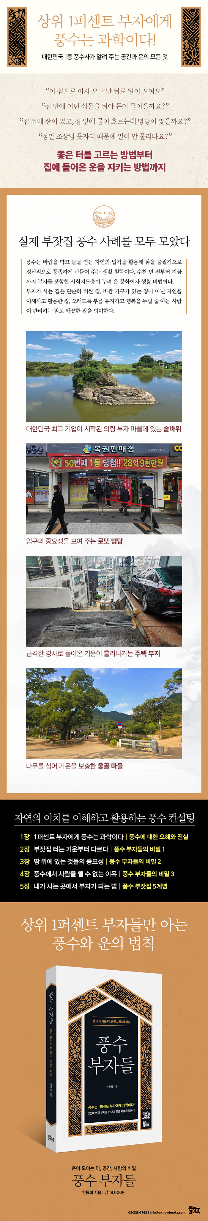 20억, 100억을 넘어 1000억이 넘는 재산을 가지고 있는 흔히 말하는 ‘초부자’들은 모든 것에 열린 마음을 가지고 있다. 자신의 능력뿐만 아니라 운과 환경이 얼마나 중요한지에도 관심을 가지며 풍수를 적극적으로 활용한다. 땅과 사람은 연결되어 있다. 좋은 땅은 좋은 사람과 이어지고, 좋은 사람은 좋은 기운과 이어진다. 물건의 위치를 옮기거나 좋은 땅에 좋은 집을 짓는 것으로 내 삶이 180도 바뀌지는 않지만, 내가 사는 곳을 돌아보고 마음을 두는 것에서 변화는 시작된다.