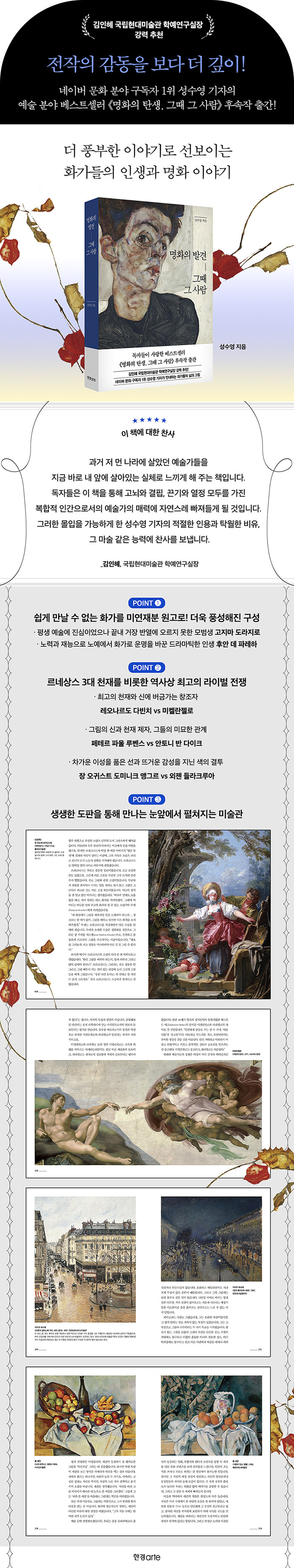 매주 칼럼을 통해 미술 이야기를 전하고 있는 성수영 기자는 어렵고 딱딱하게 느껴지는 미술이 아닌, 쉽고 재미있게 미술을 접할 수 있도록 돕는다. 연재된 글을 모아 한 권의 책으로 소장하고 싶다는 독자들의 요청에 힘입어 출간하게 된 첫 책 《명화의 탄생, 그때 그 사람》은 많은 사랑을 받으며 화제가 됐다. 그 후속작인 《명화의 발견, 그때 그 사람》은 그동안 들려주던 이야기에 한층 깊이를 더했다. 성수영 기자가 들려주는 화가들의 삶에 대해 차분히 듣다 보면 작품이 탄생하게 된 배경과 특징, 영향을 주고받았던 인물과 작품, 작품이 주는 의미 등을 자연스럽게 익힐 수 있다. 또한 레오폴트 미술관을 비롯해 루브르, 메트로폴리탄, 뉴욕현대미술관 등 세계 유명 미술관의 소장품을 이 책 한 권으로 즐길 수 있어 손쉽게 명화를 감상하고 싶은 이들에게 귀중한 선물이 될 것이다.