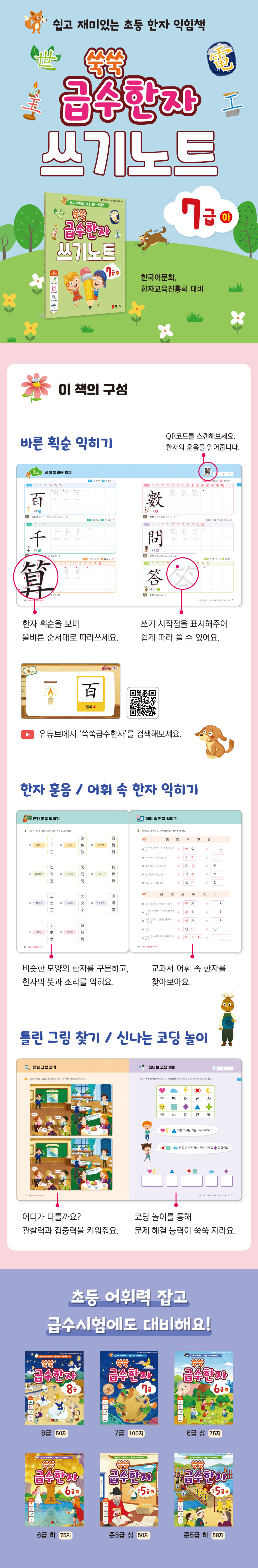 초등 어휘력을 꽉 잡아주는 한자 공부! <쑥쑥 급수한자 7급 하 쓰기노트>와 함께 재미있게 배워요.