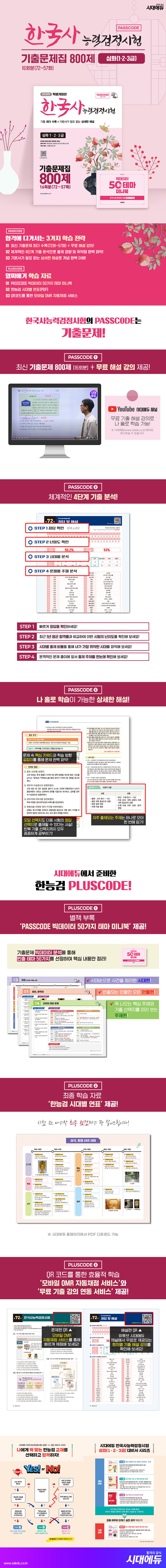 ㈜시대고시기획에서 출간한 ‘PASSCODE 한국사능력검정시험 기출문제집’! 한국사수험연구소에서는 기출문제의 출제 경향과 학습자의 취약 부분을 한눈에 파악할 수 있도록 4단계 기출 분석을 제시합니다. 기본서가 필요 없는 상세한 해설로 혼자서도 학습이 가능하며, PASSCODE 빅데이터 50가지 테마 미니북, 한능검 시대별 연표를 통해 1급 합격에 다가가 보세요!