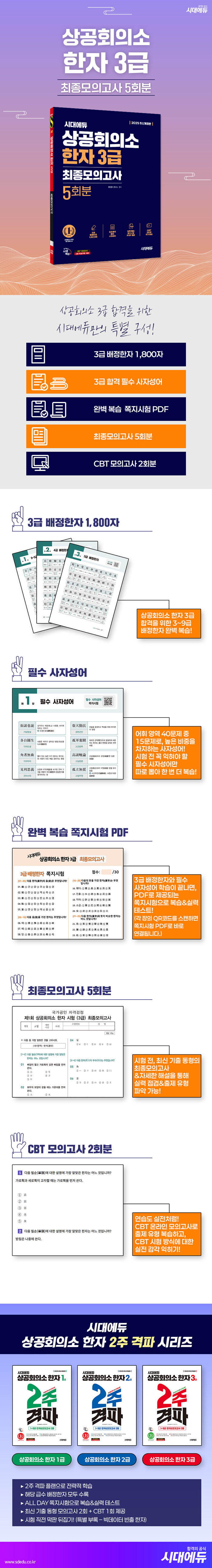 본서는 상공회의소 한자 3급 시험에 대비하기 위한 최종모의고사 도서로, 상공회의소 한자 시험의 최신 출제 경향을 반영하였습니다. 3~9급 배정한자 1,800자를 모두 수록해 시험 전 다시 한번 복습할 수 있도록 하였고, 시험에 꼭 출제되는 필수 사자성어를 수록하여 출제 비중이 큰 사자성어 영역을 대비할 수 있도록 하였습니다. 3급 배정한자와 필수 사자성어를 학습한 후에는 PDF로 제공되는 쪽지시험 4회분을 통해 복습과 실력 테스트를 할 수 있습니다. 모든 복습이 끝나면, 최신 기출 동형의 최종모의고사 5회분을 풀며 출제 유형을 완벽히 파악할 수 있고, 추가로 제공되는 CBT 온라인 모의고사 2회분을 통해 상공회의소 한자 시험에 대한 실전 감각을 기를 수 있습니다.