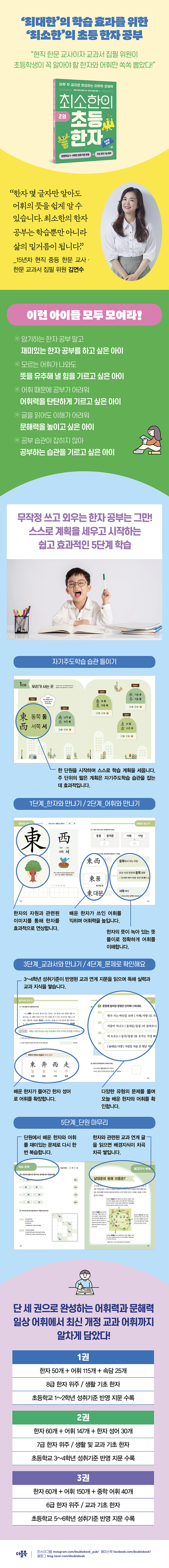 ≪최소한의 초등 한자≫ 1권에서 획순이 적고 쉽게 이미지를 떠올릴 수 있는 한자로 한자에 대한 이해와 흥미를 올렸다면, 2권은 ‘우리’라는 주제를 가져와 주변에 관심을 갖도록 한자를 뽑았다. 동네, 자연, 언어, 생활 등 일상에서 겪는 일과 보는 사물을 중심으로 한자에 대한 흥미를 이어나간다. 또 배운 한자와 연관된 속담을 매일 하나씩 읽고 생각을 넓힐 수 있는 코너도 있다. 한자를 공부하며 평소 사용하는 말의 뜻을 다시 정확하게 새기고, 더욱 풍부한 언어생활을 할 수 있을 것이다. 2권은 3~4학년 교과 성취기준을 반영한 지문을 수록하여 교과 학습의 기반을 다질 수 있도록 하였다.