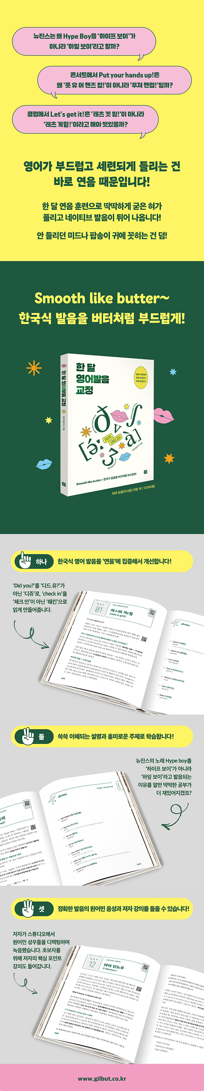 이 책은 영어 발음에서 '연음'에 집중한 책이다. 각각의 단어는 어렵지 않은데 합쳐지면 잘 안 들리는 'Did you get it?(ㄷ쥬게릿)'같은 표현과 문장을 한 달 동안 집중적으로 훈련 시켜 짧은 시간에 눈에 띄게 발음이 좋아지게 해준다.