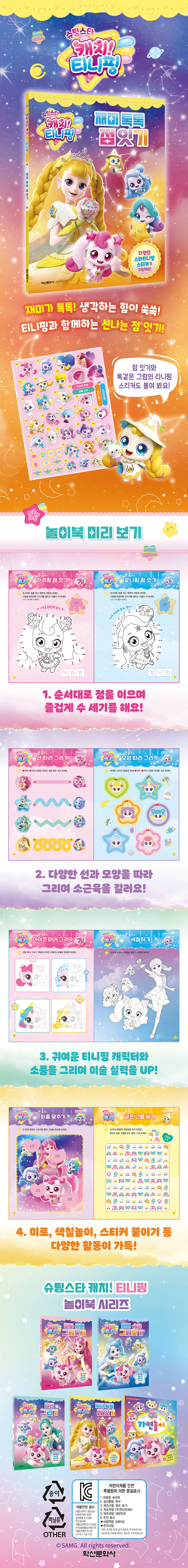 귀여운 티니핑 캐릭터 일러스트와 함께 재미있게 학습할 수 있는 두뇌 개발 놀이북이다. 점 잇기, 그림 찾기, 스티커 놀이 등 다양한 학습을 한 권의 책으로 경험할 수 있다. 활동을 통해 아이들은 관찰력, 인지력, 이해력, 집중력, 문제 해결 능력 등을 기르며 두뇌를 다방면으로 발달시킬 수 있다.