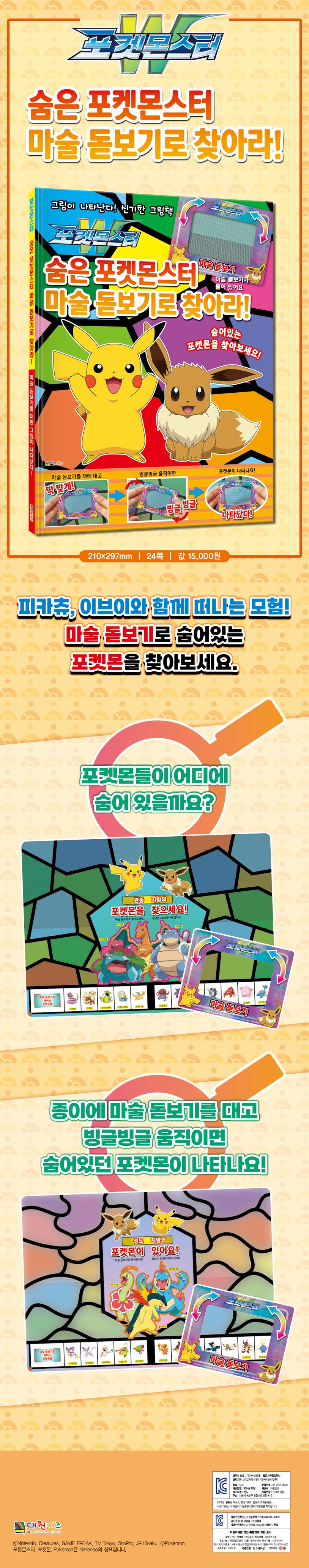 숨어 있는 포켓몬을 찾아 떠나는 <숨은 포켓몬스터 마술 돋보기로 찾아라>! 관도지방, 성도지방, 호연지방, 신오지방, 하나지방 등 여러 지방의 포켓몬들이 숨어 있어요! 피카츄, 이브이와 함께 숨어 있는 포켓몬들을 마술 돋보기로 찾아보세요. 잘 모르겠다면 모습이나 형태 힌트를 살펴보세요. 처음 만나는 포켓몬이라도 바로 알 수 있답니다! 다 함께 포켓몬 찾기에 도전해 보세요!