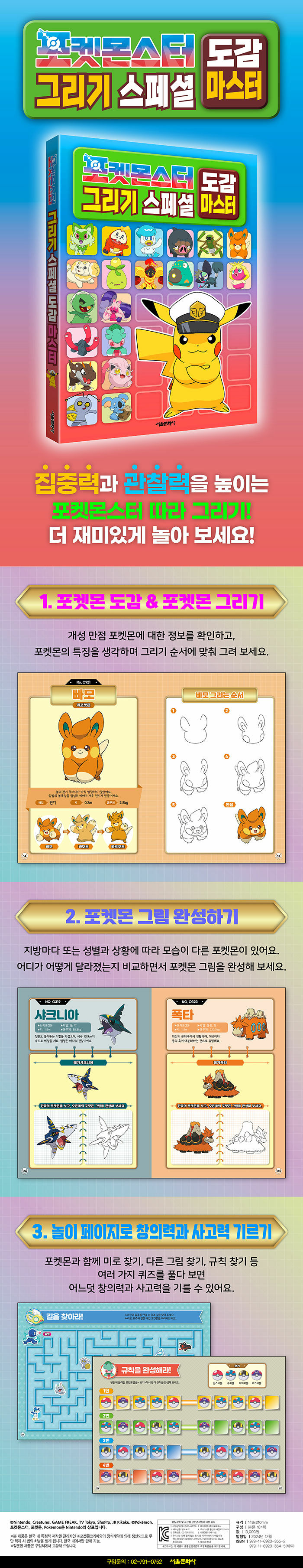새로 만나는 포켓몬부터 반가운 포켓몬까지! 포켓몬의 특징을 생각하며 그리기 순서에 따라 포켓몬을 그려 보세요. 포켓몬 그리기를 완벽 마스터 할 수 있어요. 그리고 나만의 방법으로 다시 한번 포켓몬을 그리기에 도전해 보세요. 그리기를 통해 어느덧 집중력과 관찰력이 향상될 거예요. 또한 다른 모습의 포켓몬을 관찰하고 어떤 부분이 달라졌는지 비교해서 그리면 그림 그리기가 훨씬 재미있어요. 마지막으로 포켓몬과 함께 퀴즈까지 풀면, 어느새 포켓몬마스터가 될 거예요.