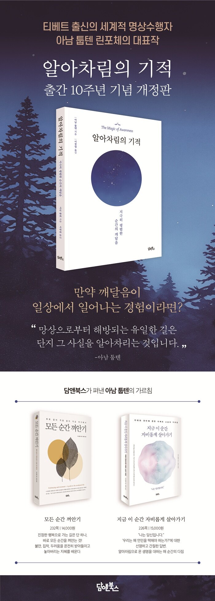 이 책은 아남 툽텐 린포체의 대표작 『알아차림의 기적』의 출간 10주년을 기념해 선보이는 개정판이다. 2014년 출간된 이 책은 지난 10년 동안 저자의 대표작으로 손꼽히며 독자들의 많은 사랑을 받아 왔다. 개정판은 번역 일부를 수정 보완하고 새로운 표지로 단장했다.