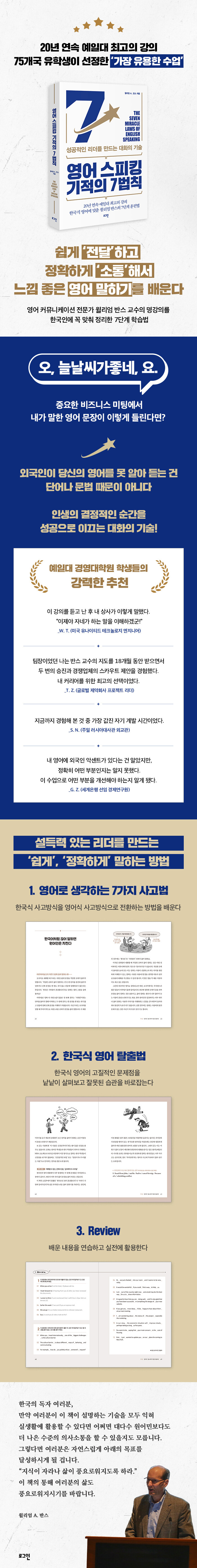 이 책은 예일대 경영대학원에서 수많은 유학생의 영어 커뮤니케이션을 담당해 온 윌리엄 반스 교수의 수업을 ‘7단계 영어 학습법’으로 정리하고 성공적인 영어 말하기 방법을 소개한다. 특히 ‘한국어식 사고방식’을 ‘영어식 사고방식’으로 전환하고 한국인에게 유독 두드러지는 영어 오류를 짚어보면서 한국의 독자를 위한 맞춤 솔루션을 제공한다.