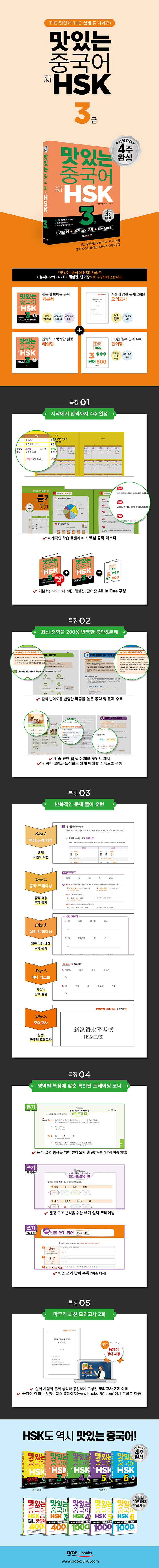 『맛있는 중국어 HSK 3급』은 한눈에 보이는 공략 「기본서(+모의고사 2회)」, 간략하고 명쾌한 「해설집」, 1~3급 필수 단어 600 「단어장」으로 구성되어 있습니다.