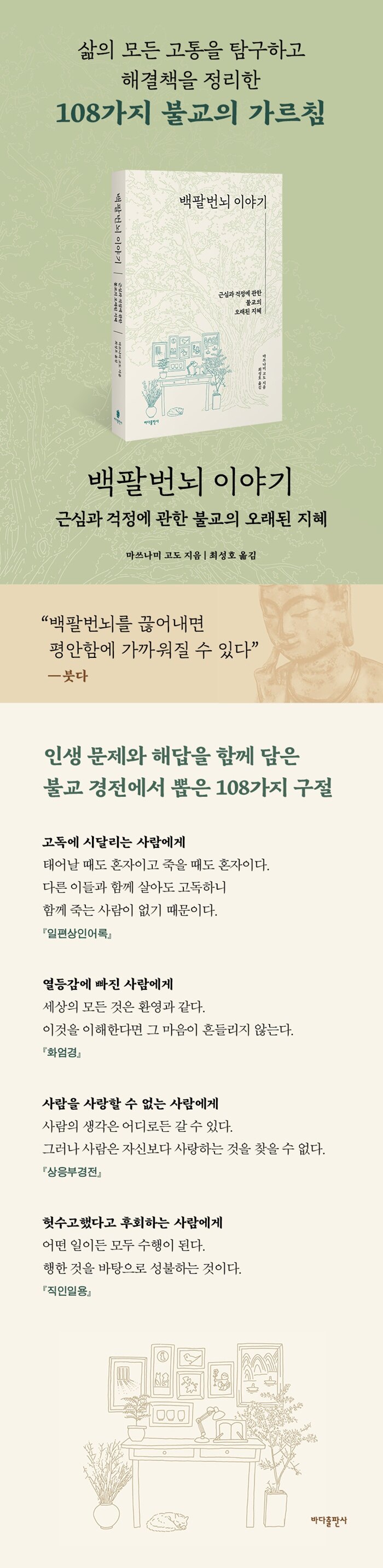 이 책 《백팔번뇌 이야기》에서 소개하는 『사십이장경』에는 다음과 같은 구절이 있다. “거울을 닦고 먼지를 제거하여 깨끗하게 만들면 자기 모습을 제대로 볼 수 있다.” 거울 앞에 선 자도 ‘나’고, 먼지를 제거하여 깨끗게 만드는 것도 ‘나’이며, 제대로 볼 수 있는 모습도 ‘나’이다.