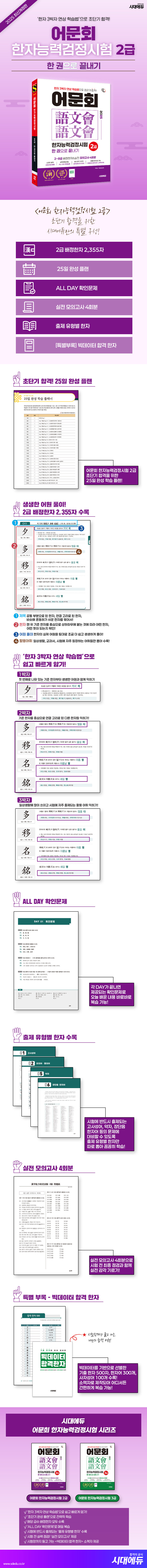교육부 현상 공모 당선! 박정서·박원길 저자의 읽기만 해도 저절로 외워지는 ‘한자 3박자 연상 학습법’으로 어문회 한자능력검정시험 2급에 빠르고 쉽게 합격할 수 있도록 구성하였습니다.