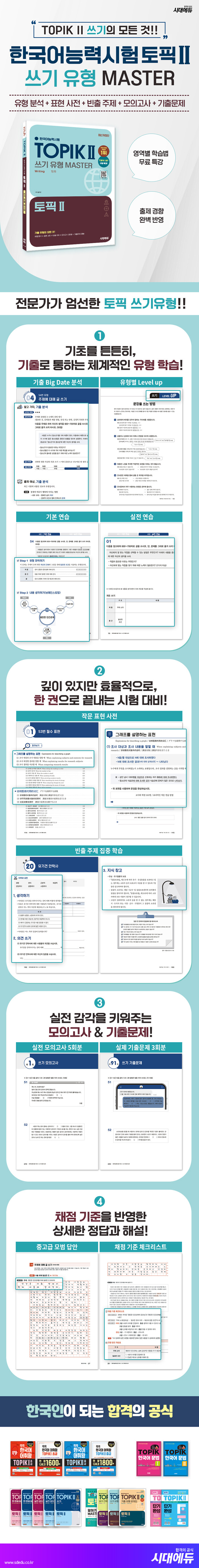 이 책은 한국어를 공부하는 외국인 수험생들이 TOPIK II 쓰기 영역을 집중적으로 학습할 수 있도록 다음과 같이 구성하였습니다.