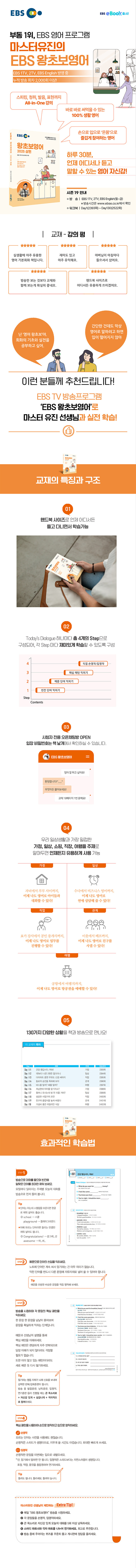 『EBS 왕초보영어』는 영어를 알긴 아는데 영어로 말하려고 하면 입이 떨어지지 않는 왕초보들을 위한 교재입니다. EBS TV 방송 프로그램 “EBS 왕초보영어”로 마스터유진 선생님과 함께 더욱 실제적이고 적극적인 학습이 가능합니다. 요일별 주제마다, Today’s Dialogue를 기반으로 한 4개의 STEP으로 구성하여, 각 STEP마다 초보자들이 자신감을 가지고 재미있게 학습할 수 있도록 구성되어 있습니다. 우리 일상생활과 가장 밀접한 가정, 일상, 직업, 관계, 여행을 주제로 하여, 알아 두면 언제든지 유용하게 사용할 수 있습니다.