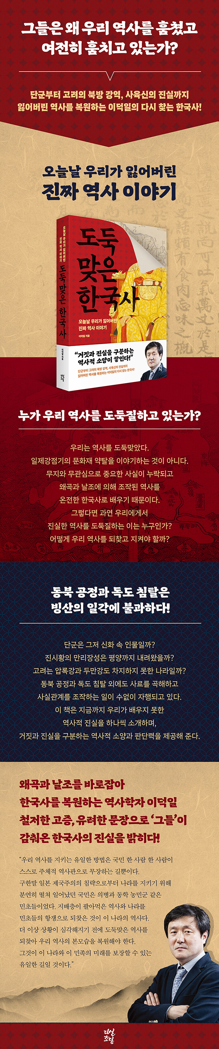 우리는 역사를 도둑맞았다. 무지와 무관심으로 중요한 사실이 누락되고 왜곡과 날조에 의해 조작된 역사가 온전한 한국사로 둔갑했기 때문이다. 과연 우리가 빼앗긴 역사는 무엇이며, 그것을 어떻게 되찾고 지켜야 할까? 올바른 역사 해석으로 역사 인식의 새로운 지평을 개척해 온 한가람역사문화연구소 이덕일 소장은 이 책에서 도둑맞은 채 숨겨진 가장 비밀스러운 우리 역사를 찾아 나선다. 단군은 그저 신화 속 인물일까? 진시황의 만리장성은 평양까지 내려왔는가? 고려는 압록강과 두만강도 차지하지 못한 나라일까? 사육신을 일곱 명이라고 우기는 자들은 누구인가? 이처럼 이 책은 지금까지 우리가 단 한 번도 배우지 못한 역사적 진실을 하나씩 소개하며, 거짓과 진실을 구분하는 역사적 소양과 판단력을 제공한다.
