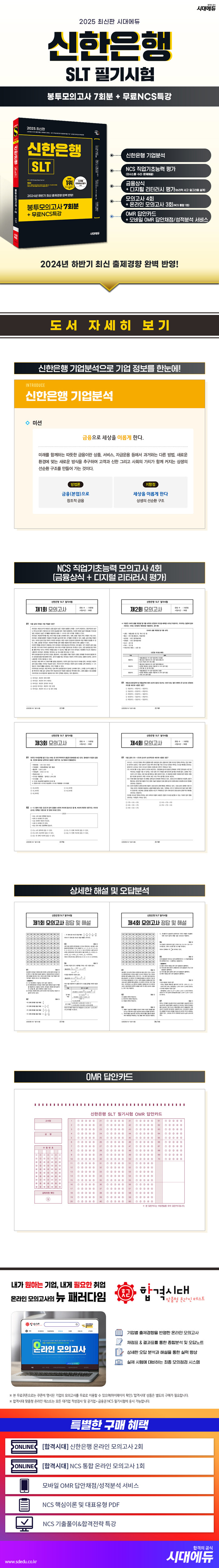 신한은행 기업분석과 최신 출제경향을 반영한 모의고사 4회분을 수록하였다. 또한 OMR 답안카드 및 OMR 답안채점/성적분석 서비스를 제공하여 자신의 실력을 스스로 점검할 수 있도록 하였다. 온라인 모의고사 3회분(NCS 통합 1회 포함)을 제공하여 신한은행 SLT 필기시험에 완벽히 대비할 수 있도록 하였다.
