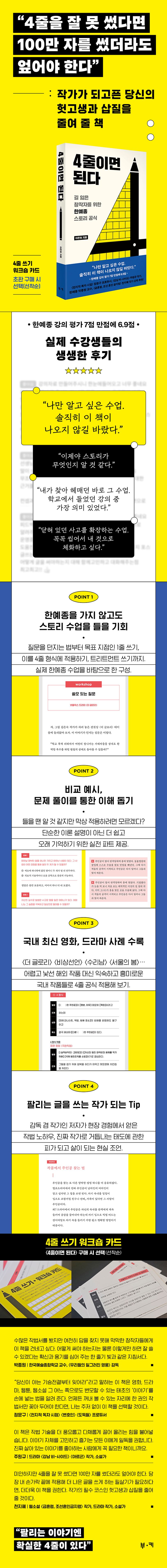 창작자들의 산실 한예종에서 학생들에게 극찬받는 시나리오 수업을 이끄는 이 책의 저자는 모든 글에 적용해도 다 통하는 틀에 박힌 기승전결이 아니라, 사건에 관한 새로운 정의를 바탕으로 오직 이야기에 적용될 수 있는 특별 공식 ‘4줄’을 강조한다. 주인공의 내적 자아의 변화에 초점을 맞춰 기록한 이 ‘4줄’은 저자가 20년간 글을 쓰고 영화 현장에서 직접 부딪혀 가며 알아낸 이야기의 핵심, 아니 전부라 해도 과언이 아니다. 4줄의 힘을 직접 경험한 학생들은 이 내용을 다른 사람들과 공유하고 싶지 않다고 책 출간을 만류했지만, 저자는 이제 시작하는 많은 작가가 함께 성장하길 바라는 마음으로 책을 썼다.
