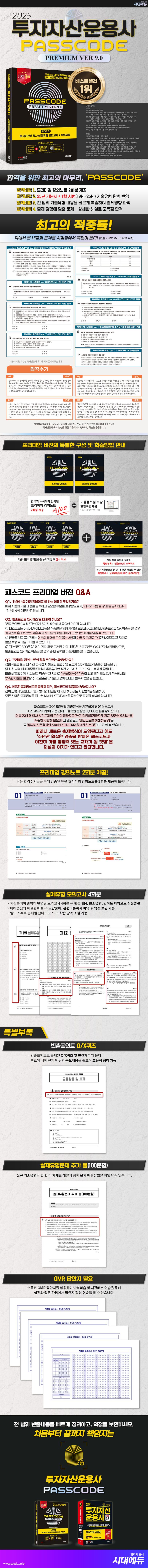 투자자산운용사 시험은 시험범위가 방대함에도 출제 문제 수가 100문항밖에 되지 않으므로, 주로 어떤 내용과 유형이 시험에 반영되어 왔는가를 파악하는 것이야말로 합격 여부를 결정할 수 있는 핵심이라 할 수 있습니다. 패스코드를 충분히 이해할 경우 시험의 88% 정도를 커버할 수 있습니다. 시대에듀 ‘한권으로 끝내기’ 도서는 패스코드를 충분히 이해할 수 있는 개념 체계를 제공하며, 교재의 특성상 패스코드보다 더 많은 범위를 커버하고 있습니다. 따라서 한권으로 끝내기의 학습 기반 위에 패스코드로 마무리하는 것이 가장 이상적인 시험 준비라 볼 수 있습니다.