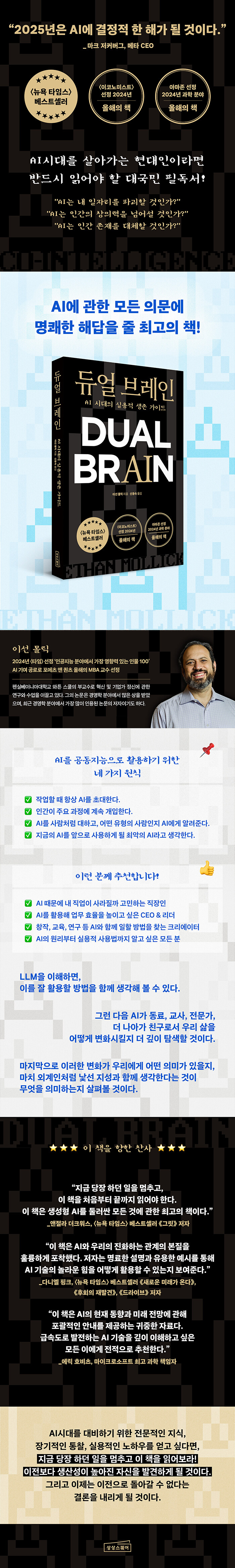 <듀얼 브레인>은 이러한 시기에 꼭 필요한 지식과 통찰을 제공하는 책이다. 대격변의 시대를 맞아 주목해야 할 점이 무엇이며, 어떻게 대비해야 하는지를 매우 수준 높은 관점에서 분석하여 제시하고 있다. 그러면서도 이해하기 쉬운 비유와 흥미로운 사례를 들어 독자가 쉽게 접근할 수 있도록 배려하고 있다. AI 시대를 대비하기 위한 최고의 교양서이자 실용서라고 강력히 추천한다.
