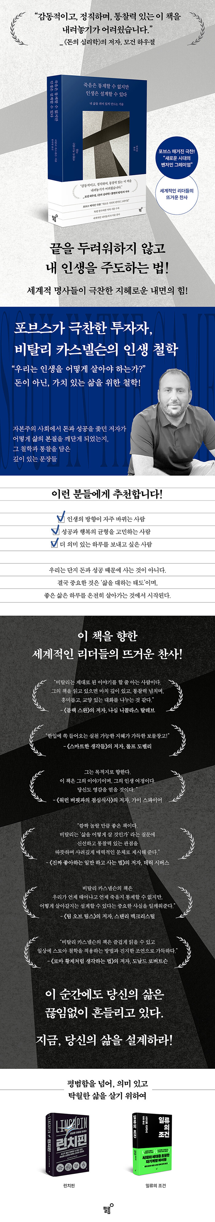 『죽음은 통제할 수 없지만 인생은 설계할 수 있다』는 투자자로서 물질적 성공을 거둔 비탈리 카스넬슨이 어느 날 깨닫게 된 더 중요한 것, 삶을 위한 투자에 대한 이야기다. <파이낸셜 타임즈>, <포춘> 등 유수의 매체에 글을 기고하며 시작된 그의 글쓰기 여정은, 돈과 성공에만 몰두하며 삶의 방향을 잃어버린 많은 이들에게 다시 한번 자신을 돌아볼 기회를 제공한다. 그는 글을 쓰면서 비로소 자신이 무엇을 위해 살아가야 하는지를 고민하기 시작했고, 그 과정에서 철학과 클래식 음악을 통해 삶의 본질을 찾게 되었다.