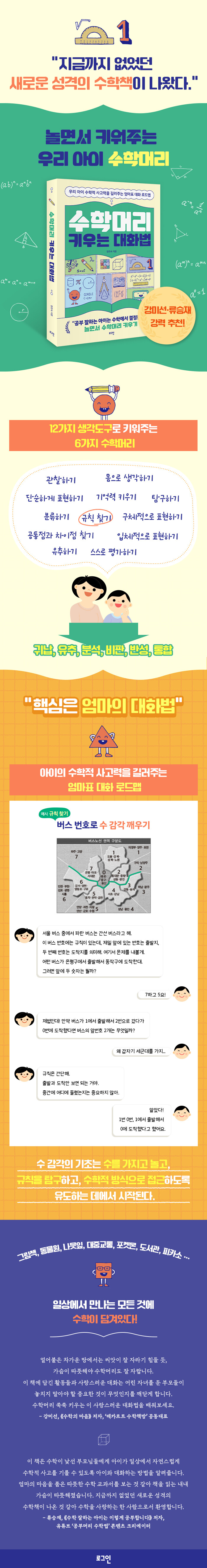 12가지 생각도구를 바탕으로 6가지 수학머리를 키우는 활동을 할 때 중요한 건 엄마의 대화법입니다. 함께 활동을 하면서 아이가 그 주제에 관심을 보인다면 관심을 더 끌어내 주는, 아이가 먼저 입을 열지 않으면 보채기보다 충분히 기다리며 아이의 생각을 물어봐 주는, 그런 엄마의 말이 필요합니다.
