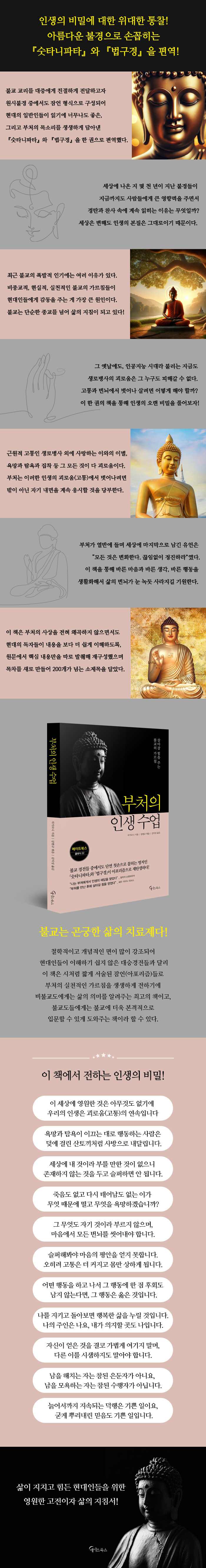 ‘고전을 대중에게 친절하게 전달하고자’ 원시불경 중에서도 잠언(아포리즘) 형식으로 구성되어 일반인들이 읽기에 너무 좋은, 부처의 목소리를 가장 생생하게 담아낸 『숫타니파타』와 『법구경』을 편역해 감동적인 한 권의 책으로 묶어냈다. 『숫타니파타』와 『법구경』은 원시불교의 가장 대표적인 불경들이다. 『숫타니파타』는 불교계에서 현존하는 경전 가운데 가장 오래된 불교 경전이기에 부처의 초기 설법에 가장 가까우며, 시구로 이루어진 내용은 매우 청정하고 단순하고 아름답다. 『법구경』은 불경 중에서 현재 전 세계에서 가장 많이 읽히는 불경으로, 원시불교 교단 내에서 다양한 형태로 구전되던 시를 모아놓아 감동을 자아낸다. 철학적이고 개념적인 면이 강조되어 현대인들이 이해하기가 결코 쉽지 않은 대승경전들과 달리 이 두 권의 기념비적인 원시불경은 시처럼 짧게 서술된 아포리즘들로 부처의 실천적인 가르침을 생생하게 전하기에 비불교도에게는 삶의 의미를 알려주는 최고의 책이라고 할 수 있고, 불교도들에게는 불교에 본격적으로 입문할 수 있게 도와주는 책이라 할 수 있다.
