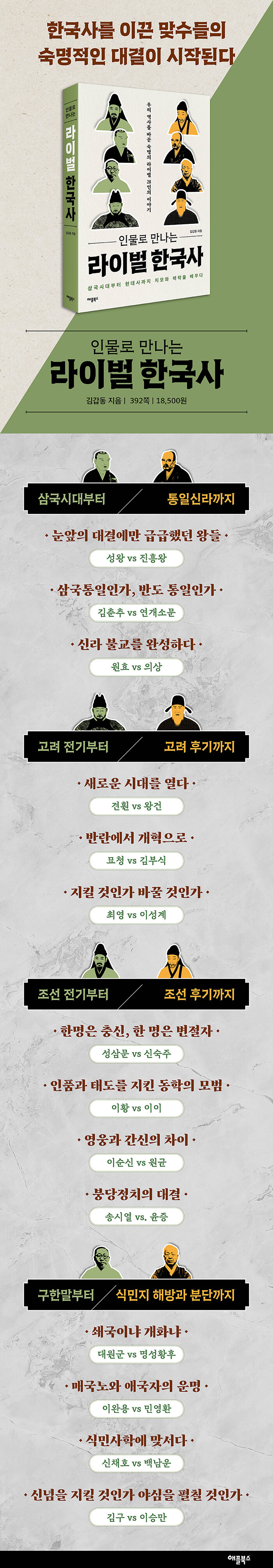 《인물로 만나는 라이벌 한국사》는 삼국시대부터 현대사까지 라이벌 관계에 있던 인물들을 통해 한국사를 재조명하고 있다. 같은 시대를 살지만 서로 다른 선택을 했던 양자의 입장을 비교함으로써, 각 인물들의 다른 시작과 말로, 삶의 여정은 물론 각 시대를 뜨겁게 달궜던 갈등과 쟁점을 한눈에 볼 수 있게 하였다. 특별히 라이벌 간에 발생했던 주요 사건과 중심사상을 놓치지 않고 다뤄서 일반 독자들도 새로운 시각으로 흥미롭게 한국사를 이해할 수 있도록 구성하였다.