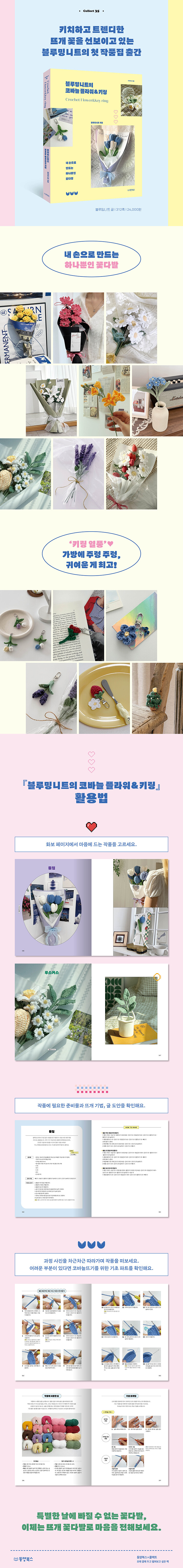유튜브를 통해 내 손으로 만드는 하나뿐인 뜨개 꽃다발을 선보이는 ‘블루밍니트’의 첫 책이 출간되었다. 가장 많은 사랑을 받은 튤립, 장미, 해바라기, 카네이션부터 새롭게 선보이는 샤스타데이지, 거베라, 프리지아, 동백꽃 등 20종의 꽃을 담았다. 그뿐만 아니라 포인트 아이템으로 사랑받는 미니 키링 10종을 선보인다. 블루밍니트의 자세한 과정별 사진과 친절한 설명 그대로 따라만 가면 어렵지 않게 뜨개 꽃을 완성할 수 있다. 코바늘이 처음인 초보자를 위한 기초 코바늘 기법도 QR 영상과 함께 제공한다.