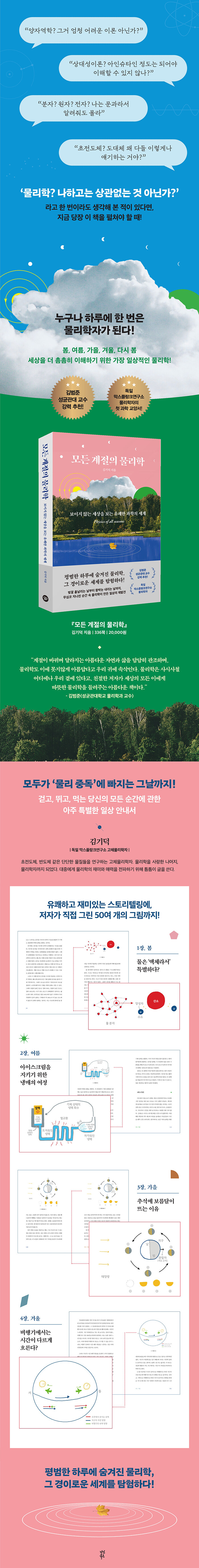 『모든 계절의 물리학』은 그런 저자가, 일상이라는 세계를 물리학자의 시선으로 새롭게 바라본 과학 에세이기도 하다. 과학 잡지 《스켑틱》, 고등과학원 웹진 《호라이즌》, 아태이론물리센터 웹진 《크로스로드》 등 다양한 매체에 칼럼을 연재하고, 유튜브 〈삼프로TV〉, KBS 〈이슈 Pick, 쌤과 함께〉 등 여러 방송에 출연하며 다져온 저자의 유쾌하고 재미있는 스토리텔링은 마치 한 편의 산문집을 읽는 듯한 착각을 불러일으킬 것이다.