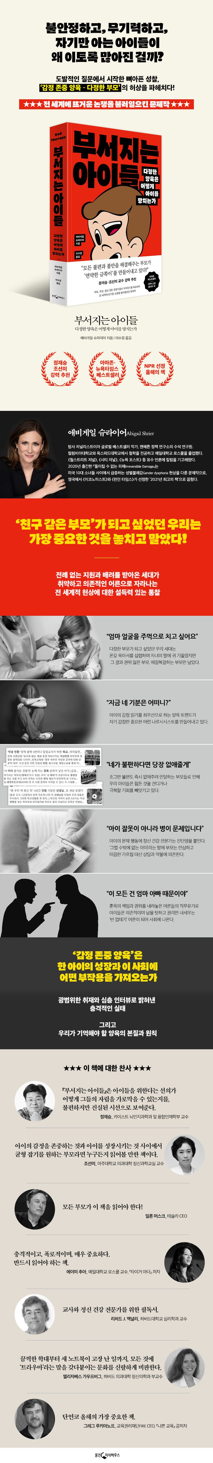 ‘감정 존중 육아’와 ‘다정한 부모’라는, 이 시대가 너무나도 당연하게 받아들였던 가치관의 맹점을 정면으로 드러낸 『부서지는 아이들』은 “읽고 나니 다름 아닌 내가 아이를 망치고 있었다는 걸 깨달았다”, “아이를 키우며 고민하고 있는 지점과 완벽하게 맞닿은 책”, “불편하지만 한 번은 짚고 넘어가야 하는 문제” 등 전 세계 부모들의 폭발적인 자기 고백을 이끌어냈다. “한 아이를 키워내기 위해서는 온 마을이 필요하다”는 격언처럼, 이 책은 자녀를 키우는 가정뿐만 아니라 우리 사회를 건강하게 만드는 데 관심 있는 모두가 읽어야 할 쓰디쓴 약이다.
