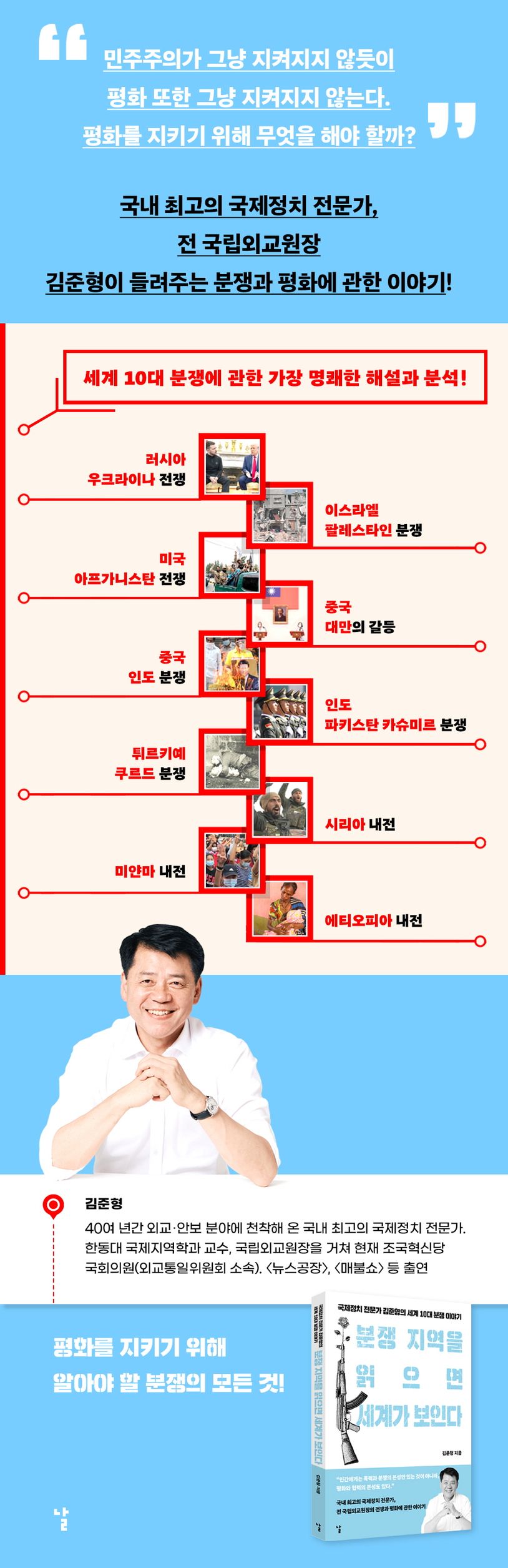 《분쟁 지역을 읽으면 세계가 보인다》는 최근의 분쟁 10가지를 엄선해 이들 분쟁이 어떤 배경에서 일어났고, 어떻게 진행되었으며, 무엇을 남겼는지 살펴본다. 10가지 분쟁은 종전을 앞둔 러시아-우크라이나 전쟁을 필두로 이스라엘-팔레스타인 분쟁, 미국-아프가니스탄 전쟁, 중국-대만의 갈등, 중국-인도 분쟁, 인도-파키스탄 카슈미르 분쟁, 튀르키예-쿠르드 분쟁, 시리아 내전, 미얀마 내전, 에티오피아 내전이다.