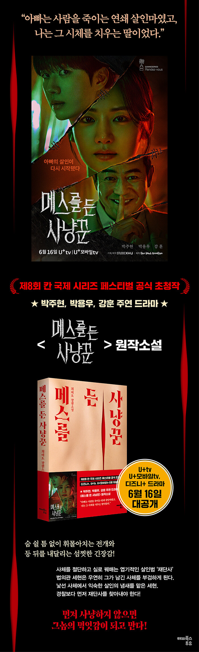 아직도 세현은 머릿속으로 그가 좋아하던 순서를 하나도 틀리지 않고 읊어낼 자신이 있었다. 절단은 무조건 칼날을 직각으로 찔러 넣을 것, 적출할 때는 직접 손을 사용하고, 피부는 보이는 즉시 박리한다. 조균은 사람을 죽이는 연쇄 살인마였고 세현은 그 사체를 치우는 딸이었다.