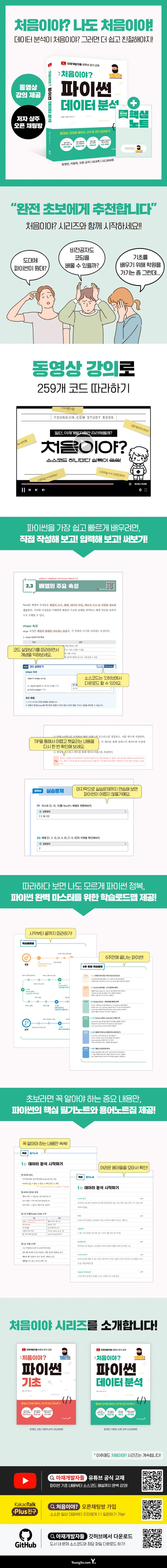 『처음이야, 파이썬 데이터 분석』은 파이썬을 처음 접하는 사람도 바로 실습할 수 있도록 구성된 데이터 분석 입문서입니다. 복잡한 이론보다는 구글 코랩 환경을 활용한 실습 중심 구성으로, NumPy와 Pandas를 활용한 배열 계산, 데이터 전처리, 통계 요약, 고윳값 분석 등의 기능을 하나하나 따라 하며 익힐 수 있도록 짜임새 있게 설계되었습니다.
