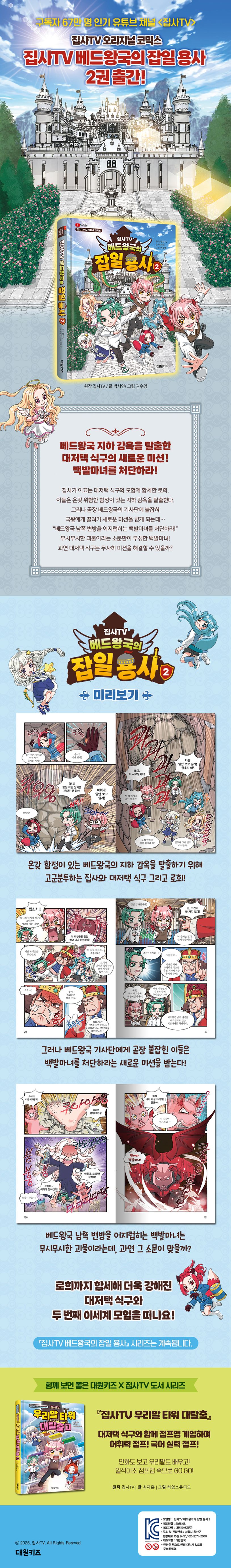 잠에 들어야만 갈 수 있는 베드왕국을 배경으로 시작되는 『집사TV 베드왕국의 잡일 용사』 시리즈는 인기 유튜브 채널 〈집사TV〉 오리지널 콘텐츠를 재해석한 어린이 만화입니다. 대저택 식구를 이끄는 악마 집사와 각기 다른 매력을 지닌 또이, 료미, 멜로우, 푸딩제리, 로희의 이세계 모험담을 다루고 있지요. 이 책에서 집사와 또이, 료미, 멜로우, 푸딩제리는 위험에 빠진 베드왕국을 구할 용사로, 로희는 베드왕국의 기사단장으로 변신합니다. 2권부터는 로희가 대저택 식구에 합류해 본격적인 이세계 모험을 시작하지요. 집사가 이끄는 대저택 식구와 함께 적과 맞서 싸우고 미션을 해결하며 환상적인 이세계 모험을 하다 보면 성장하는 어린이에게 필요한 우정, 의리, 용기를 자연스럽게 느낄 수 있답니다. 대원키즈에서 최초로 출간된 〈집사TV〉 어린이 만화 『집사TV 베드왕국의 잡일 용사』 시리즈와 함께 눈을 뗄 수 없는 흥미진진한 이세계 베드왕국 모험 속으로 떠나 보아요!