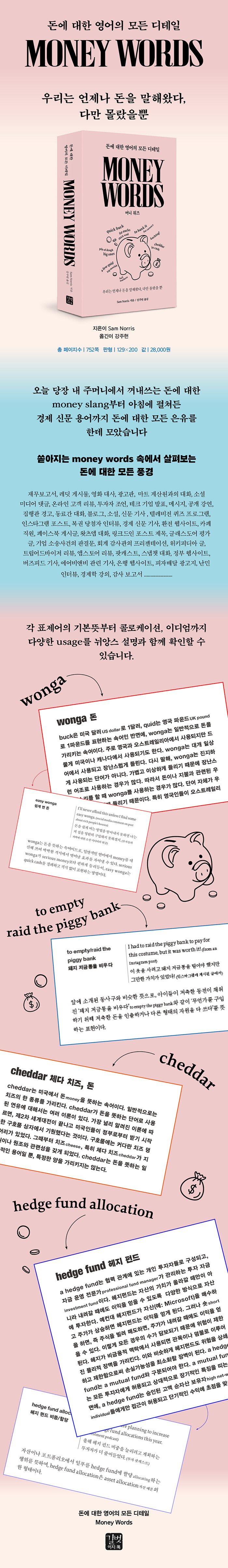 돈에 대한 다양한 표현인 bucks, wonga, moolah, cheddar, bacon, bread, dough, brass, wads, green 등 문화적 배경 속에서 캐주얼하게 살펴볼 수 있는 money slang부터 레딧, 틱톡, 버즈피드, 왓츠앱 메시지, 팟캐스트, 경제학 교과서, 테크 기업 발표, 신문 기사, 링크드인 포스팅 등의 커뮤니케이션 환경에 이르기까지 돈에 대한 유연하고 풍부한 화법을 담았습니다.