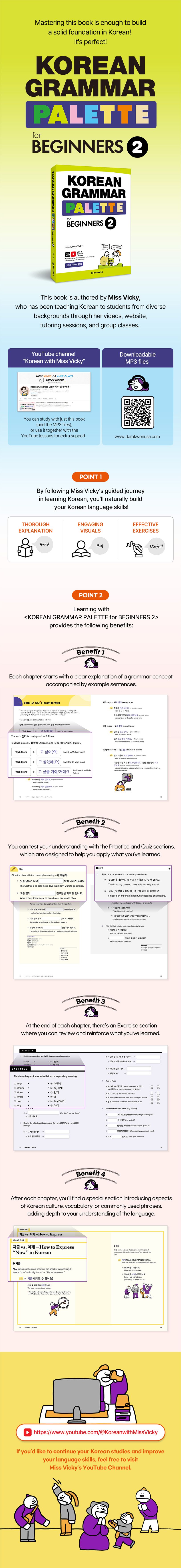 If you complete 〈Korean Grammar Palette for beginners 1 & 2〉, which are carefully written and reviewed by Miss Vicky to include all the essential grammar beginner learners need, you’ll have a strong foundation that will carry you well beyond the beginner stage as you explore new grammar and expressions with confidence.