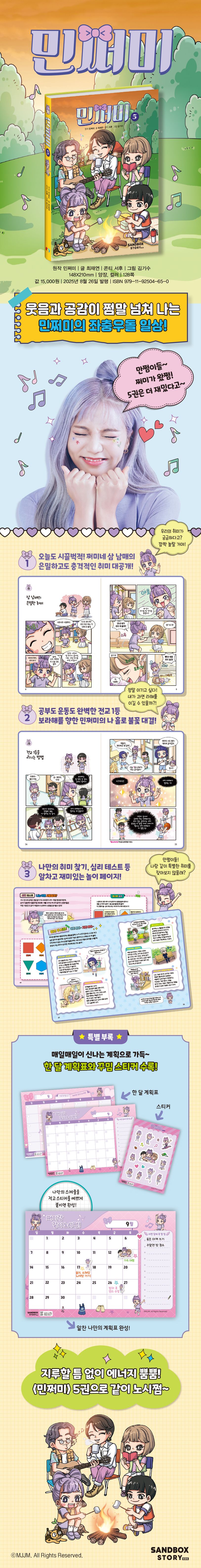 <민쩌미> 5권은 만화만큼 놀이 페이지도 쩜말~ 재미있어요. 만화를 모두 읽었다면 놀이페이지에서 쉬어 가시쩜! ‘집중력 쑥쑥, 스도쿠 챌린지!’, ‘이런 취미~ 저런 취미~’, ‘나는 어떤 사람일까?’ 등 알찬 놀이 페이지도 가득 담겨 있답니다. 특별 부록인 한 달 계획표에 가족 행사, 약속, 해야 하는 일을 적어 보세요. 귀여운 민쩌미 스티커로 예쁘게 꾸미면 나만의 계획표 완성! 쩌미와 함께하면 매일매일이 더 즐거울 거예요!