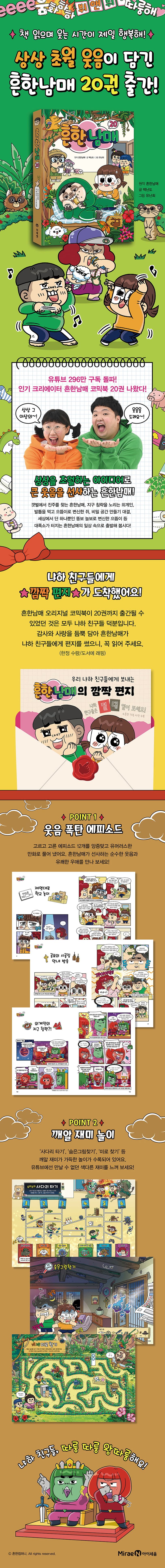 《흔한남매》 시리즈는 ‘흔한남매’ 유튜브 영상의 스토리를 앙증맞고 유머러스한 만화로 풀어 낸 코믹북입니다. 하루도 조용할 날이 없는 으뜸이와 에이미의 일상 스토리는 진짜 웃음이 필요한 어린이들에게 유쾌한 우애와 순수한 웃음을 선사할 것입니다.