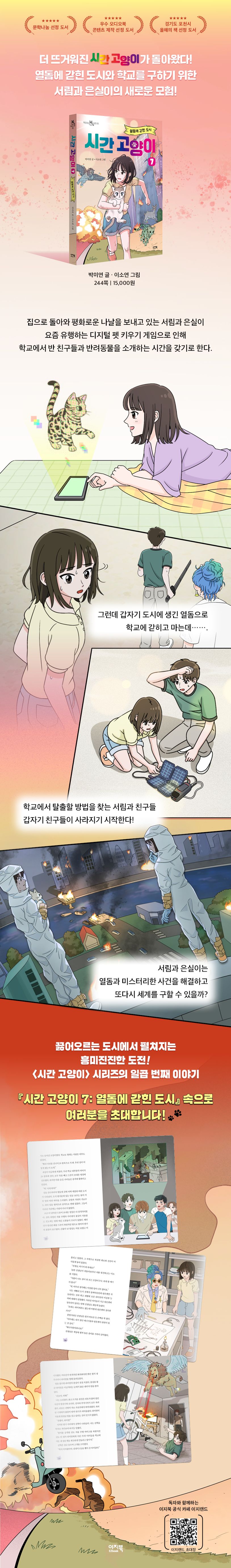 『시간 고양이 7: 열돔에 갇힌 도시』는 평화로운 나날을 보내던 서림과 은실이가 폭염으로 정전이 된 학교에 갇혀 일어나는 내용을 담았다. 박미연 작가가 전하는 여름을 강타한 폭염과 열돔, 학교에서 흔히 볼 수 있는 재료로 알 수 있는 과학 지식, 익숙한 학교에서 펼쳐지는 미스터리 실종 사건을 이소연 작가의 생생한 삽화와 함께 만난다.