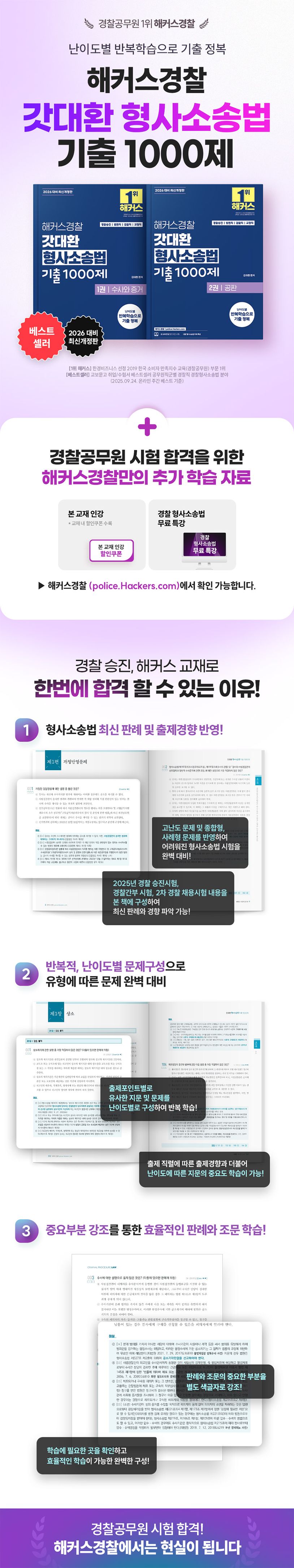〈2026 해커스경찰 갓대환 형사소송법 기출 1000제 세트〉는 경찰공무원시험 중 경찰승진 시험뿐만 아니라 그 외 형사소송법(공판 포함)을 시험과목으로 하고 있는 기타 공무원 직렬을 대비할 수 있는 문제집입니다. 또한 최근 난이도가 높아지고 있는 출제경향을 반영해서 다양한 직렬의 기출문제와 상세한 해설을 제공함으로써 기출문제 & 최신판례 & 핵심이론 정리와 난이도별 반복 학습을 할 수 있도록 구성한 문제집입니다.