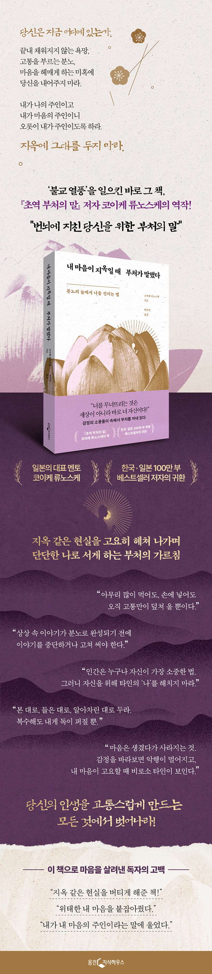 이 책은 욕망, 분노, 미혹의 세 가지 번뇌에 휘둘려 상처받는 사람들을 위한 실질적인 조언으로 가득하다. 헛된 욕망을 내려놓고 마음속 분노를 바라보는 수련, 감정에 휘둘리지 않고 현재에 집중하는 보행선(步行禪) 훈련, 자신을 존중하며 평온을 얻는 지혜까지 현실에서 바로 적용할 수 있는 다양한 마음 조절 전략을 풍부한 사례와 함께 소개했다. 그간 불행과 고통을 꾹꾹 눌러 담았던 이들에게 『내 마음이 지옥일 때 부처가 말했다』는 보다 평온하고 행복한 삶을 위한 새로운 기준을 제시할 것이다.