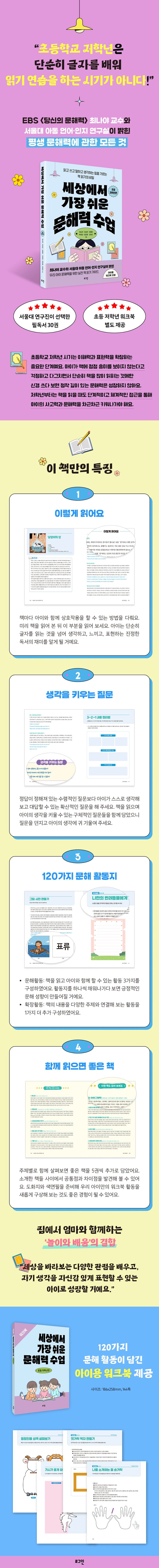 『세상에서 가장 쉬운 문해력 수업』 시리즈의 두 번째 책인 이 책은 놀이를 넘어 본격적으로 학업과 연관되는 책 읽기를 시작한 초등학교 저학년 아이를 둔 부모에게 ‘제대로 책 읽는 방법’에 대해 알려준다. 서울대학교 아동 언어·인지 연구실에서 엄선한 초등학교 1학년부터 3학년까지 학년마다 꼭 읽어야 할 도서 10권을 활용해 집에서도 단계적이고 체계적으로 아이의 문해력을 키워줄 수 있게 아이를 위한 3가지 문해 활동과 1가지 확장활동을 추가로 담았다. 아이가 책을 어떻게 읽는 것이 좋은지, 아이에게 어떤 질문을 해야 하는지, 책을 읽은 후 어떤 활동을 함께할 수 있는지 등 부모라면 궁금해하는 문해력의 모든 게 이 책에 담겨 있다.