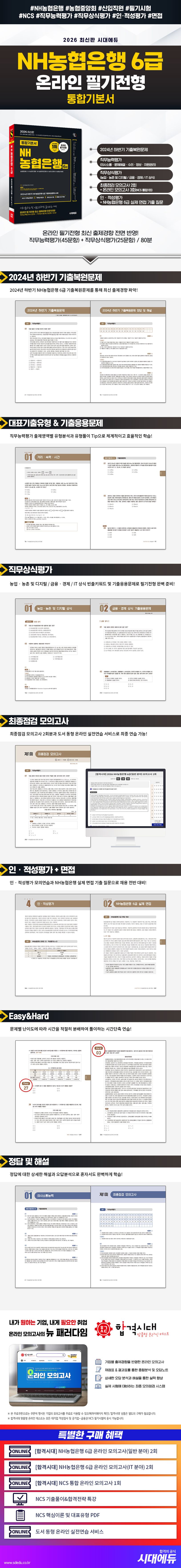 NH농협은행 6급 신규직원 채용 필기전형은 2023년부터 온라인으로 진행되고 있다. 이에 시대에듀는 NH농협은행 6급 온라인 필기전형을 준비하는 수험생들이 시험에 효과적으로 대비하도록 『2026 최신판 시대에듀 NH농협은행 6급 온라인 필기전형 통합기본서』를 출간하게 되었다.