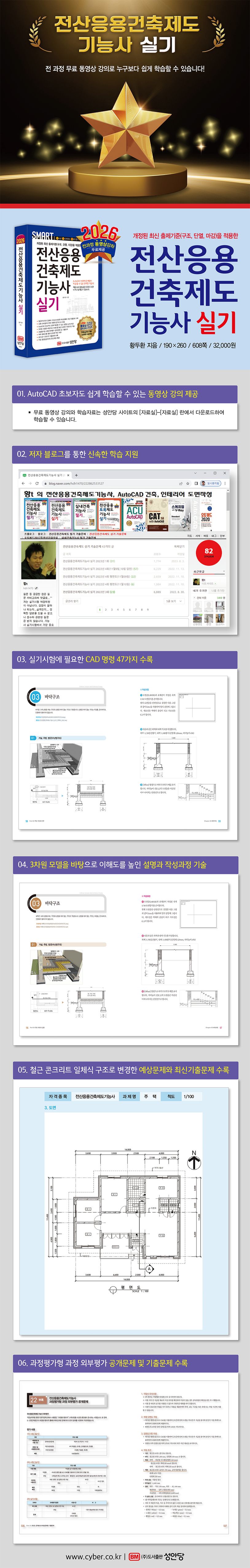 전산응용건축제도기능사는 1997년 자격종목 신설 이후 지금까지 과거의 설계조건을 그대로 출제하고, 관련 교재들도 90년대에 작성된 도면을 그대로 반영하여 많은 부분이 현실과 맞지 않았습니다. 하지만 2014년 3회(의무검정) 실기시험부터는 지금까지 출제되었던 설계조건에서 바닥구조와 단열조건이 현실에 맞게 수정되어 출제되었고, 2025년 발표한 공개문제를 수록했습니다. 또한 일선 교육기관의 요청으로 과정평가형 과정 외부 평가 공개문제 및 기출문제를 수록하였습니다. 이 책은 새로운 출제기준과 조건을 반영하여 좀 더 빠른 자격증 취득에 도움을 드릴 것입니다.