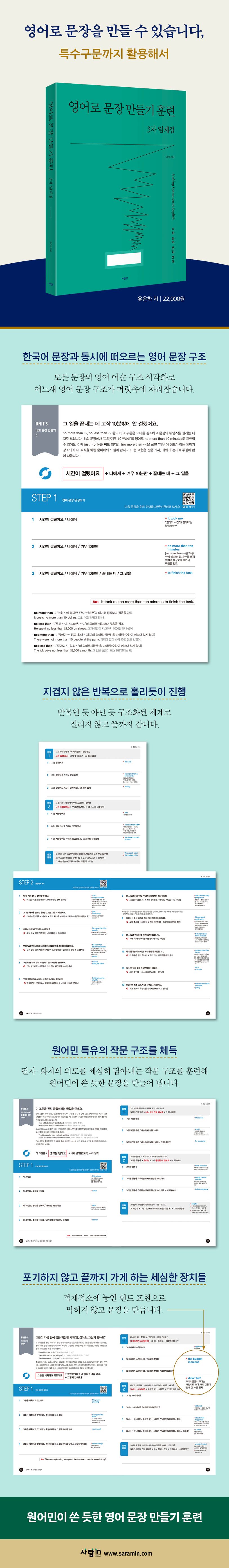 문법책에서만 봤을 뿐, 실제로 펜을 들고 써 본 적은 없는, 그렇지만 수준 높은 대화와 독해에 꼭 필요한 영어의 일명 특수구문들. 이것이 중요한 것은 화자와 필자의 의도를 나타낼 수 있기 때문입니다. 단순히 문장을 만들어 내는 것을 넘어 글을 쓰고 말을 하는 사람의 의도까지 드러내게 하는 것, 영작 훈련서가 추구해야 할 궁극적인 방향입니다.