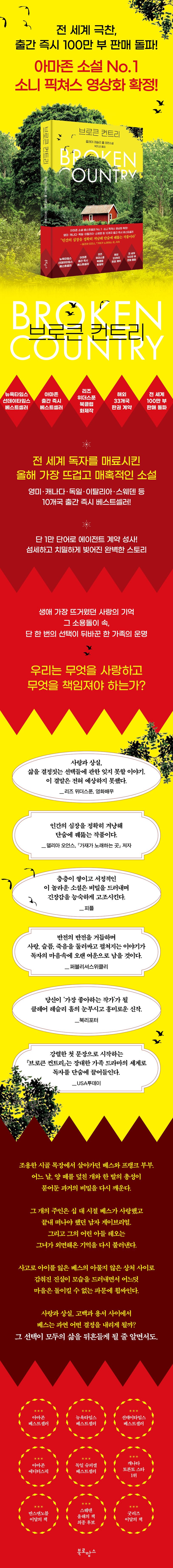 영화ㆍ드라마 업계와 글로벌 독자들의 뜨거운 관심 속에서 탄생한 『브로큰 컨트리』는 목가적 농촌을 배경으로 한 사랑 이야기와, 마지막 페이지까지 예측을 허락하지 않는 미스터리의 긴장감이 정교하게 결합된 작품이다. 그리고 상실과 침묵으로 금이 간 관계 속에서, 그럼에도 서로의 곁으로 다시 나아가는 사람들의 이야기다. 영국의 아름다운 해안도시 도싯의 한 농장에서 아이를 잃은 젊은 부부 베스와 프랭크, 그리고 오랜 세월을 돌아 다시 나타난 옛 연인 게이브리얼이 각자의 상처와 비밀을 품은 채 마주 선다. 이들 사이에 한 발의 총성이 남긴 균열은 오랜 시간 감춰온 기억과 상처를 헤집어놓고, 사랑과 용서, 책임 사이에서 흔들리는 마음들은 끝내 자신이 지켜야 할 것을 선택하도록 만든다.