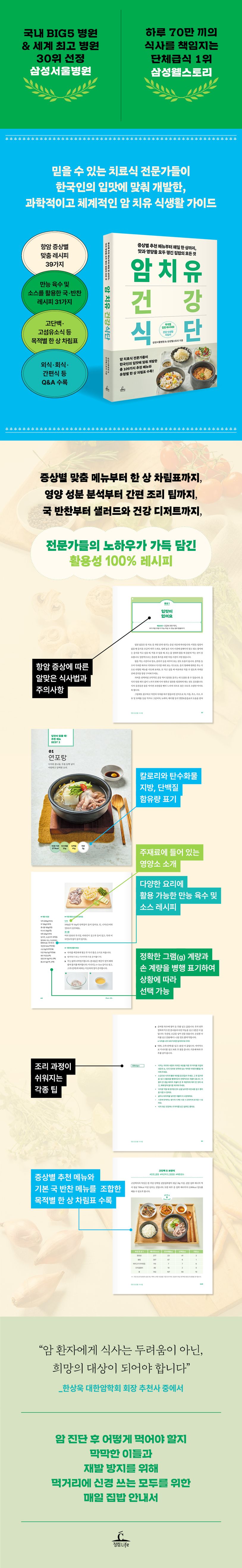 암 진단을 받고 투병 중이거나 수술 후 재발 방지를 걱정하는 사람들이 가장 신경 쓰는 것이 바로 ‘어떻게 먹을까’ 하는 부분이다. 이 책은 국내 BIG 5 병원 중 하나이며 〈뉴스위크〉 선정 세계 최고 병원 30위에 빛나는 삼성서울병원, 그리고 단체급식 1위를 차지하며 수많은 병원식을 책임지고 있는 삼성웰스토리의 전문가들이 만나 함께 개발한 메뉴와 식사법을 담은 가이드북이다.