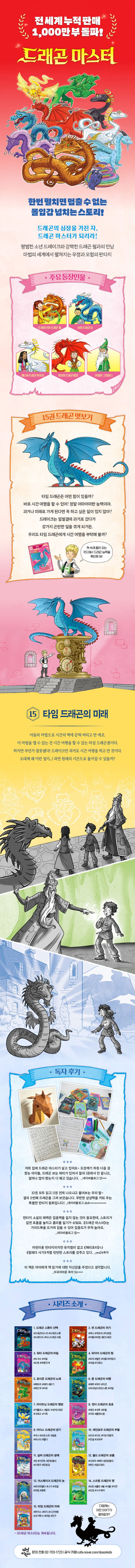 이미 알 사람은 다 아는 화제의 책 『드래곤 마스터』는 교육과 출판의 전통 강자인 ‘스콜라스틱’의 저학년 대표 챕터북(브랜치 시리즈)이다. 부담스럽지 않은 분량이어서 이제 막 긴 글을 읽기 시작하는 아이들에게 읽는 재미를 붙여 주기 좋다. 긴 시리즈임에도 후속권이 나올 때마다 아마존 베스트셀러에 오를 정도로 인기가 있어, 스토리의 재미는 이미 검증된 셈이다. 탄탄한 스토리에 캐릭터의 성격이 잘 드러나는 일러스트가 더해져 훨씬 더 풍부한 책 읽기를 경험할 수 있다.