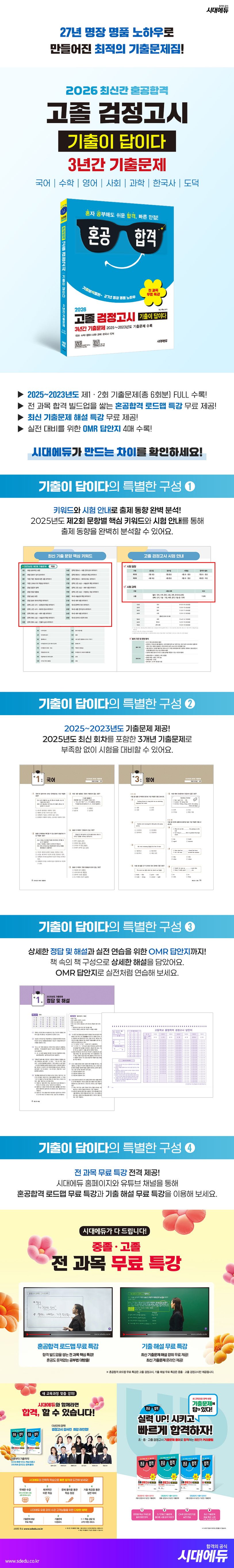 여러 환경에서 고등학교 졸업과 대학교 입학의 꿈을 이루고자 하는 분들께 조금이나마 힘이 보태고자 3년간 기출문제와 그에 대한 회차별 상세한 해설을 제공하였습니다. 검정고시를 준비하는 모든 수험생이 희망과 용기를 가지고 학업에 전념할 수 있도록 도움이 되고자 하는 마음에서 본서를 출간한 만큼 수험생 모두에게 좋은 결과가 있기를 기원합니다. 매해 더욱 발전되고 알찬 도서로 독자님들을 찾아뵐 수 있도록 최선을 다하겠습니다.