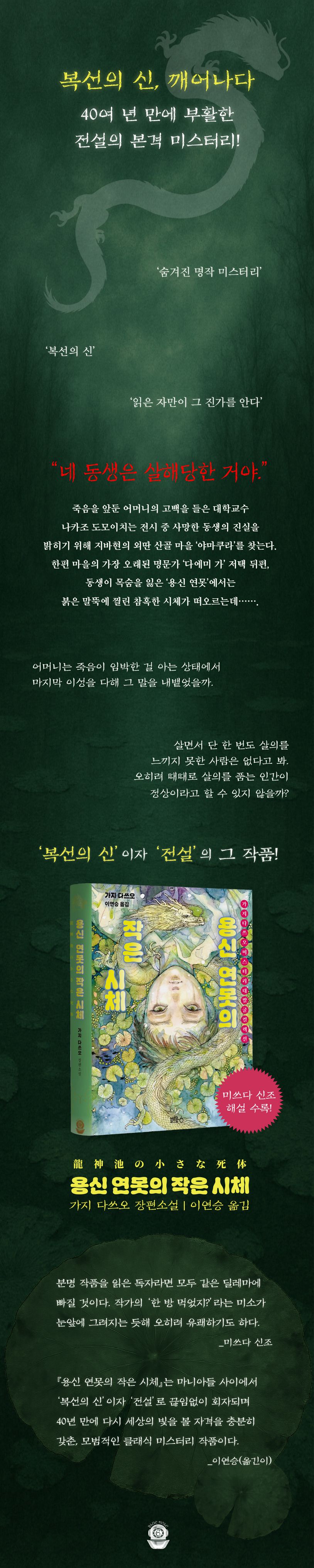 『용신 연못의 작은 시체』는 마니아들 사이에서 ‘복선의 신’이자 ‘전설’이라는 명성을 쌓은 작품으로, 마침내 40여 년 만에 부활한 전설의 본격 미스터리다. 현란한 트릭, 복선 회수, 논리적 완결성, 밀도 높은 전개와 더불어 전후의 상실감, 가족을 둘러싼 죄의식, 인간 심연의 어두운 심리 등 정통 미스터리의 본질을 총체적으로 보여준다.
